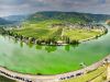 Daal af naar de rivier de Moezel met haar schitterende oevers met steile hellingen met weelderig groene wijngaarden.