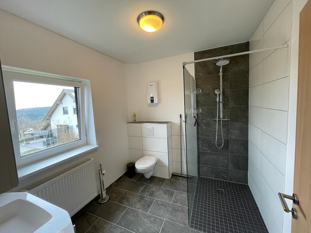 Badkamer: ruime badkamer met (hoofd)toillet, regendouche met handdouche, badmeubel met voldoende opbergruimte, raam met rolluik