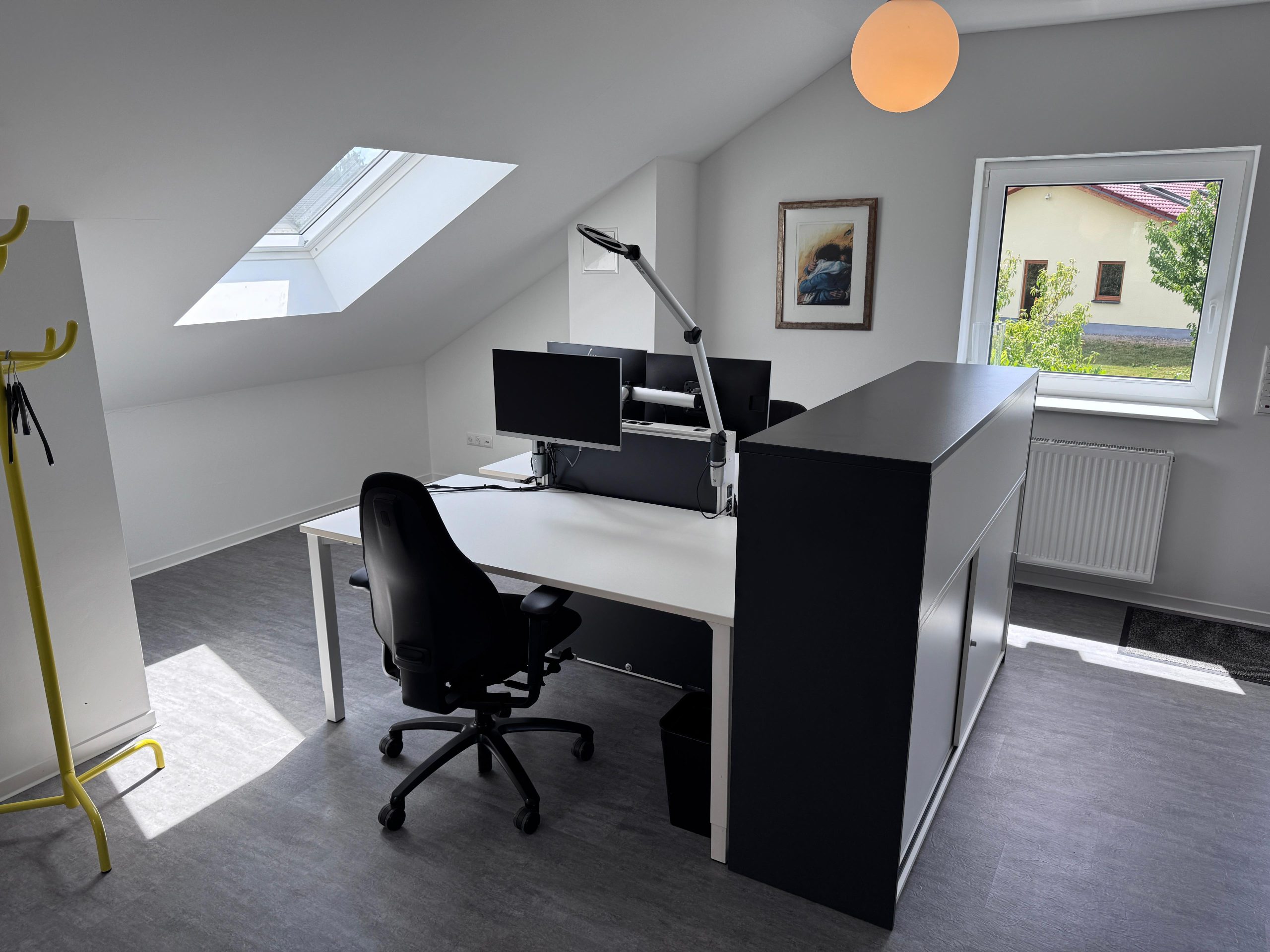 Werkplekken: Twee bureaus met goede bureaustoelen, een werkplek met 1 scherm en een werkplek met 2 schermen, Wifi is beschikbaar in de Studio
