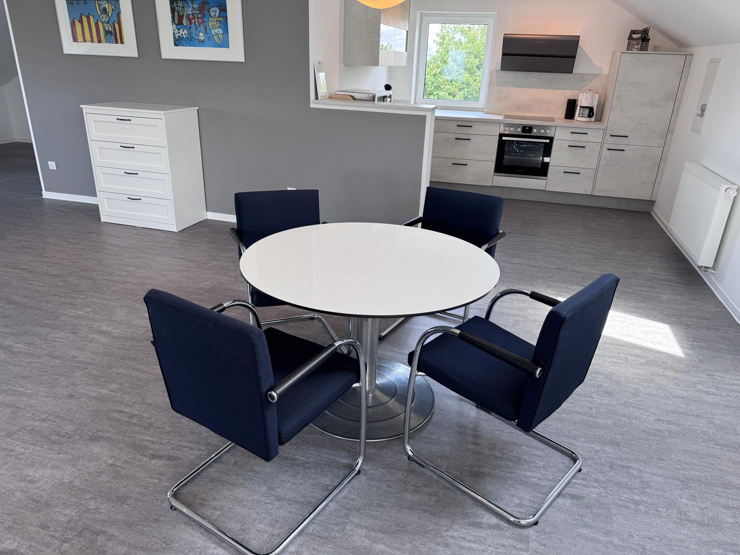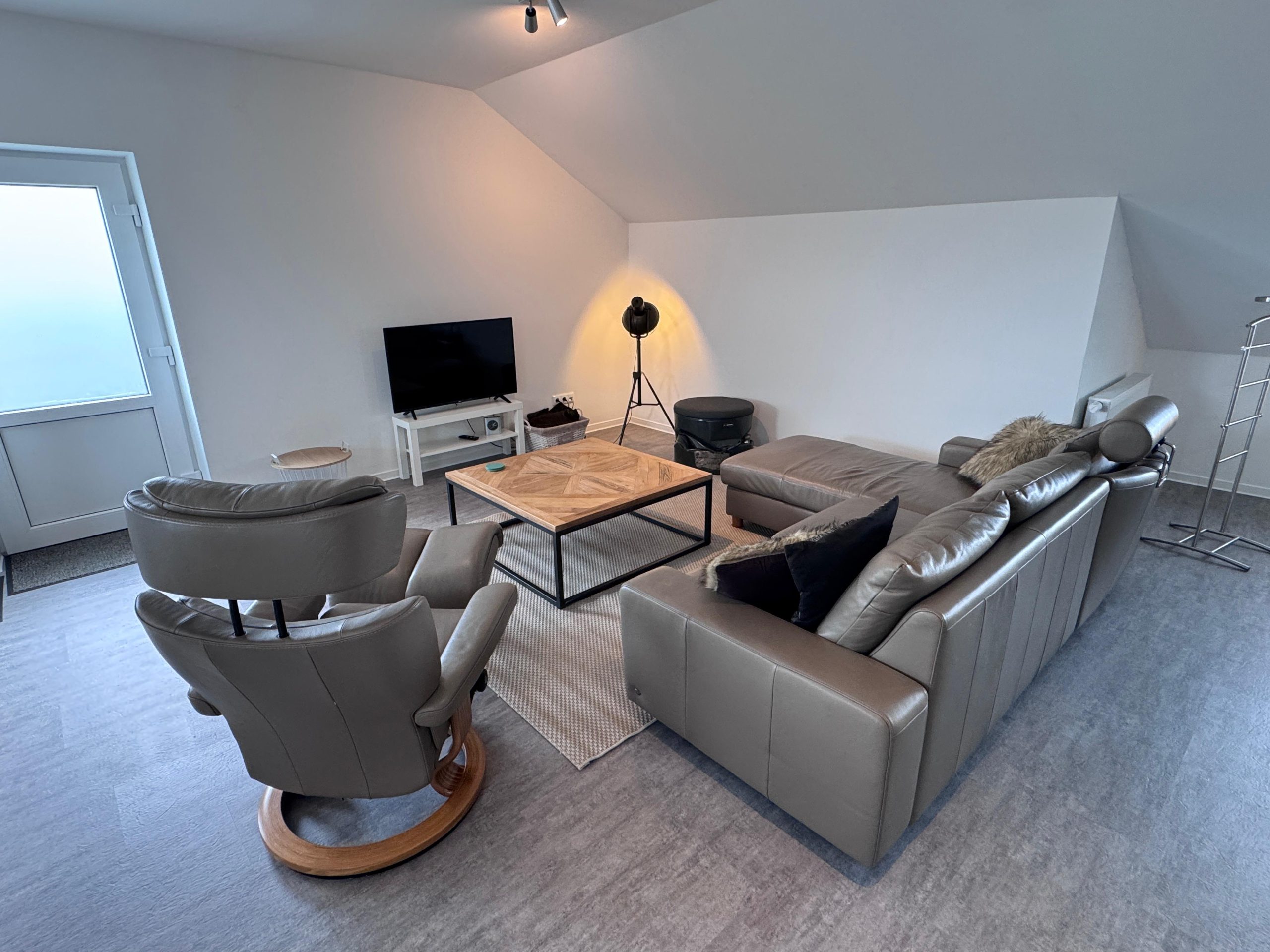 De inrichting bestaat uit een Stressless zithoek, een Boxspring (2x 90×200), een mooie eethoek van Gispen en een praktische keuken van alle gemakken voorzien. De Studio is ook voorzien van twee werkplekken met schermen en een uitstekend Wifi wat een Workcation mogelijk maakt.