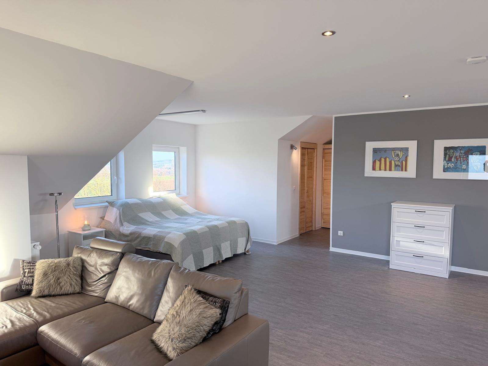 Studio: Boxspring (2x 90×200), Stressless zithoek, Gispen eettafel met 4 stoelen, dakkapel met twee ramen met rolluiken met uitzicht, 2 Velux dakramen