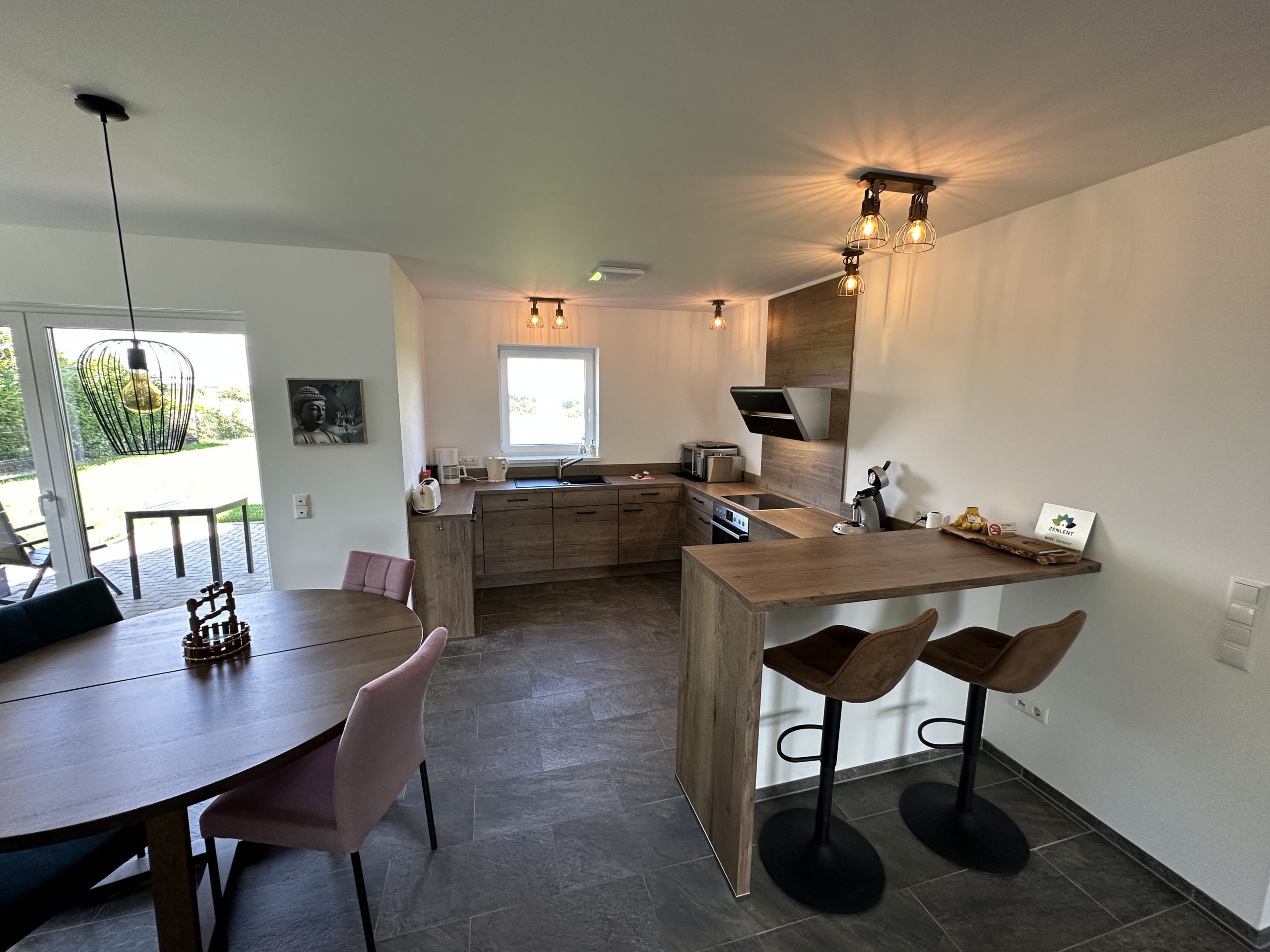 Keuken: vaatwasser, oven, magnetron, keramische kookplaat, afzuigkap, kleine koelkast met vriesvak, grote koelkast met 3 vriesladen, Senseo apparaat, filterkoffieapparaat (filters aanwezig), waterkoker, klein gourmetstel, broodrooster, elektrische citruspers, staafmixer, keukengerei, eettafel met 4 stoelen en bar met 2 barkrukken